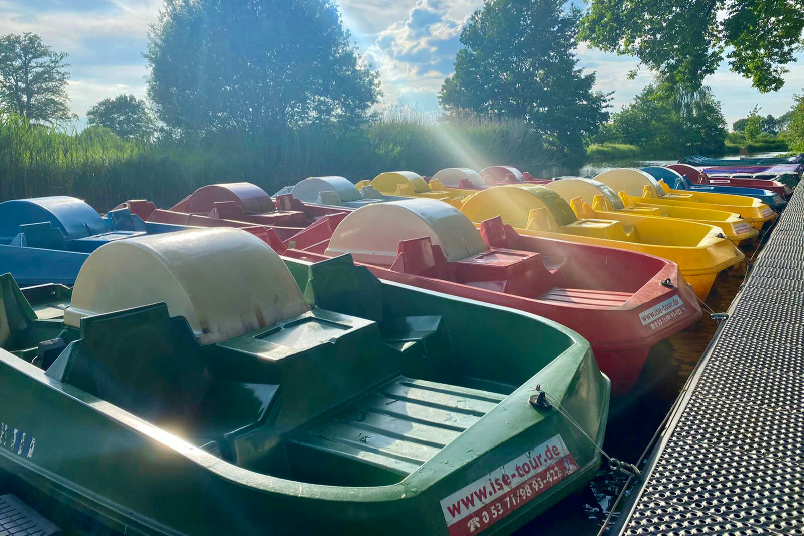 Mit einer Auswahl von Tretbooten, Kanus und Kanadiern ist für jeden Geschmack das richtige Abenteuer dabei. Der Bootsverleih hat seine Tretbootflotte für diese Saison erneuert und aufgestockt! Als Kapitän auf Zeit fährt man in den Seitenarmen der Ise bis hin zum Mühlensee umgeben von der wunderschönen Natur- und Pflanzenwelt. Manchmal trifft man auch aufeinander und sagt Enten, Gänsenund Schwänen „guten Tag“.